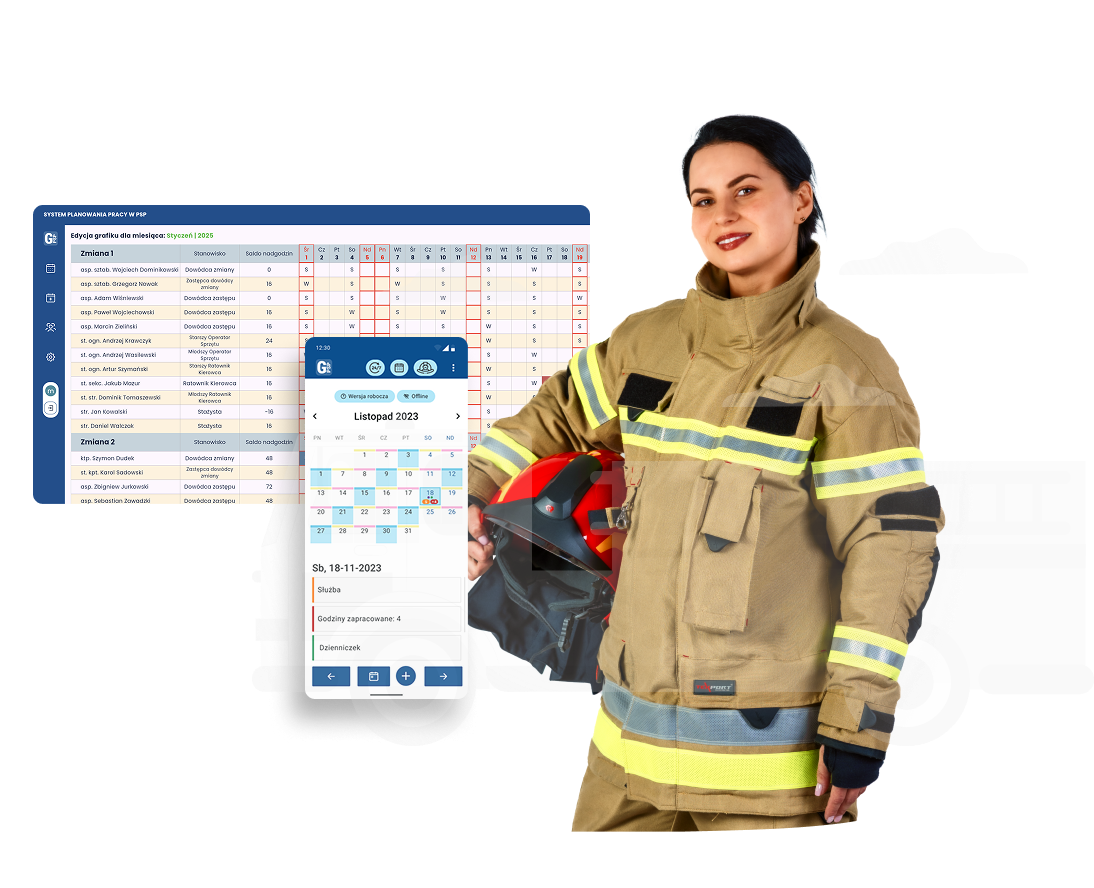 Układaj grafiki, zarządzaj służbami i usprawnij pracę w Twojej JRG. Grafik PSP to intuicyjna aplikacja, która pomaga strażakom zarządzać służbami, dyżurami, analizować czas pracy i reagować na nagłe zmiany. Dołącz już dziś i usprawnij codzienną służbę!