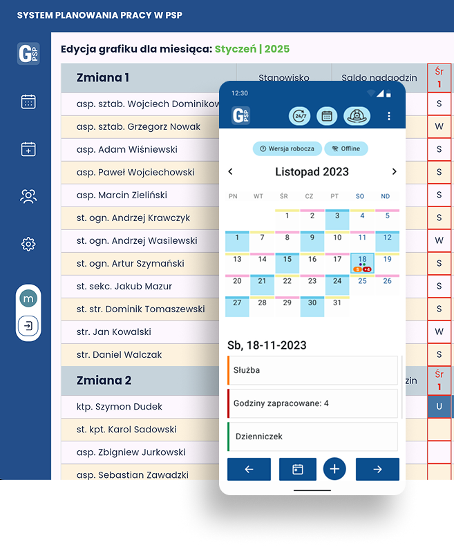 Układaj grafiki, zarządzaj służbami i usprawnij pracę w Twojej JRG. Grafik PSP to intuicyjna aplikacja, która pomaga strażakom zarządzać służbami, analizować czas pracy i reagować na nagłe zmiany. Dołącz już dziś i usprawnij codzienną służbę!